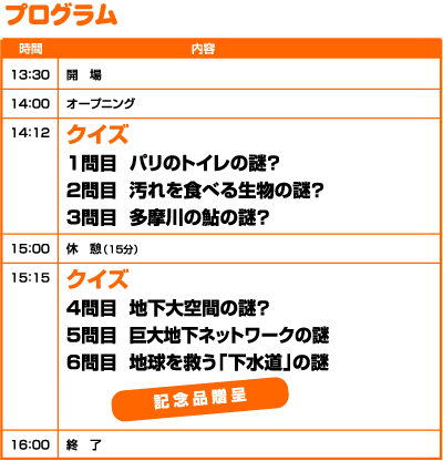 「週刊こどもニュース」のお父さん役だった・池上彰さんと、山形弁のアメリカ人・ダニエル・カールさんを迎え、皆さんが毎日使っていながら、意外に知らない下水道について、クイズを通じて楽しく学んでいただきます。成績に合せて素敵な記念品も用意しています。是非参加してください。